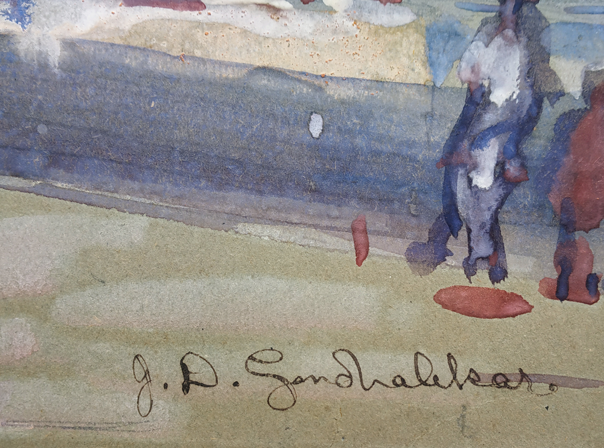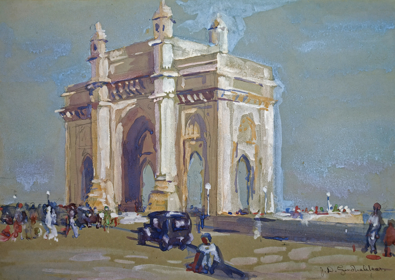 <p>Janardhan Dattareya Gondhalekar was born in 1909 in Amravati in Maharashtra. After receiving his Diploma in Drawing and Painting from the Sir J. J. School of Art in Mumbai, he travelled to England, to study at the Slade School of Fine Art in London and later at the Academie Julian in Paris. He was efficient educator, administrator and cultural visionary. Recipient of several prestigious awards, this artist continued painting throughout his career. He wrote and broadcast widely on art and he participated in art exhibitions both nationally and internationally in countries includes Belgium, Germany, England and Latin America. He was the Art Director of the Times of India, The Dean of the Sir JJ School of Art in Mumbai and The Art Director of several films.</p> <p>This work demonstrates the mastery of Gondhalekar over the watercolor medium. Spontaneous in its execution, the work depicting the iconic Gateway of India in Mumbai, has possibly been rendered on location.</p> <div> </div>