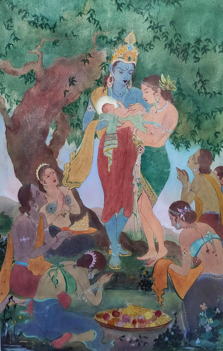 <p>The Bombay School of painting, a style developed by the students of the J J School of Art soon after it was established in 1857.The students achieved proficiency in academic realism and their style is marked by perfect rendering, bold strokes and the use of transparent watercolours.</p> <p>The Bombay revivalist movement was initiated at the J J School of art by Professor Gladstone Solomon. He was the principal from 1918 to 1936. Solomon encouraged students to adopt the legacy of Indian traditions like mural and miniature art in their visual language. He took various expeditions with students to the Ajanta caves near Aurangabad to acquaint them with the ancient cave murals.</p> <p>Hence a large number of artists from this period adopted the traditional Indian art forms and aesthetics in their subjects. Some of the well known artists of the revivalist school are R. D Dhopeshwarkar, G. H Nagarkar and Y. K Shukla.</p> <p>This work, by Kusum Ketkar, dated 1937, is a fine example of a painting done in the Bombay revivalist style.</p> <div> </div>