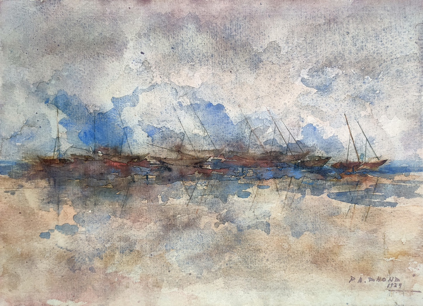 <p>Pralhad Anant Dhond(1908-2001) was born in Ratnagiri, Maharashtra. After completing his initial schooling in native Malvan, Dhond moved to Mumbai for his matriculation and joined Sir J.J. School of Art in 1930, from where he attained a Diploma in 1934. After heading the Teacher`s Training Department for 20 years, in 1958, he became the Dean of Sir J. J. School of Art. He was an accomplished portrait and landscape painter. Dhond was greatly influenced by the beauty of Konkan coast of Maharashtra and a large body of his works comprises seascapes.</p> <p>The above painting is an early work done by the artist. The abstracted landscape depicts an overcast evening at the Khar Danda coast in Bombay. Dhond's mastery over the watercolor medium is evident in the fluidic rendering of the work. The artist evokes the mood associated with the impending arrival of monsoon.</p> <div> </div>