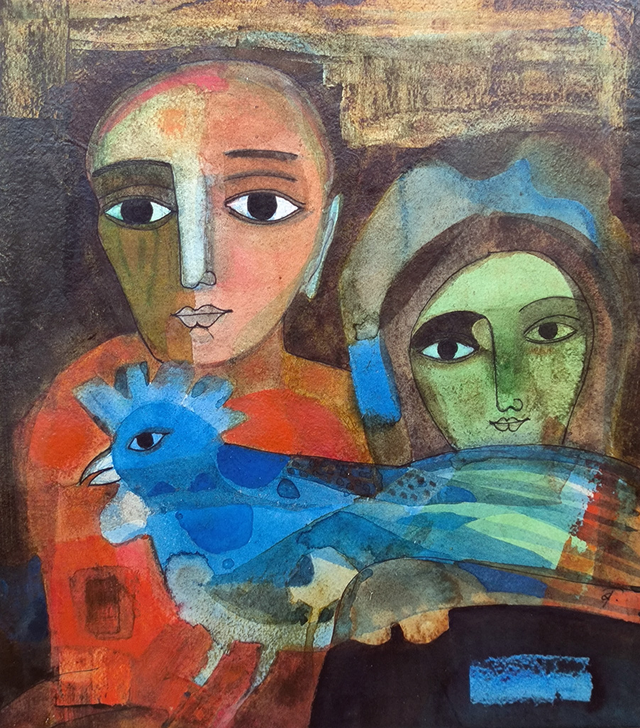 <p>Badri Narayan(1929-2013) was an eminent artist, illustrator, author and story-teller. He started painting with no formal training, and his first public show was held in 1949, followed by a solo show in 1954. In the years since, he has had over 50 solo shows and his work is in several collections, including the National Gallery of Modern Art and the National Musuem in New Delhi. His paintings are intimate and appealing, often with an element of fantasy, with simple outlines and accessible subject matter in two-dimensional stylized representations. He also illustrated children's books and wrote short stories and verse. He has been the subject of a documentary by Mumbai All India Radio, and has received numerous awards, including the Padma Shri in 1987 and the Maharashtra Gourav Puruskar in 1990.</p> <p>The artwork depicts a scene from the fable Kukkuta Jataka. It is the story of Gautama who takes the form of a rooster. A cat who had an intention of eating him, tried to deceive the rooster by offering to become his wife. Her efforts failed as the rooster was later revealed to be Bodhisattva. The story was told to a monk who was tempted by the sight of a woman.</p> <div>i8qg7ih3rl|000155BDE801|mantissa_db|tbl_products|pro_dep|6F2A50B6-74A4-4CDB-B9B6-356575AB52AF</div>