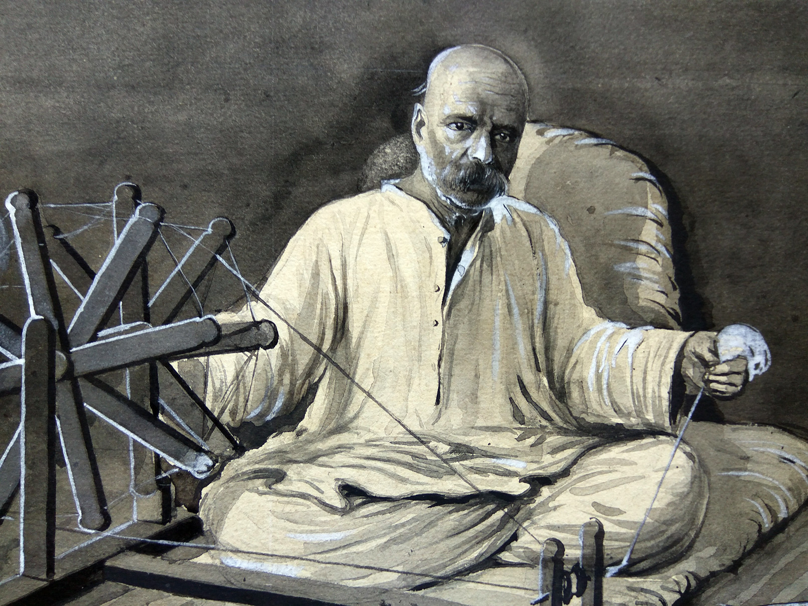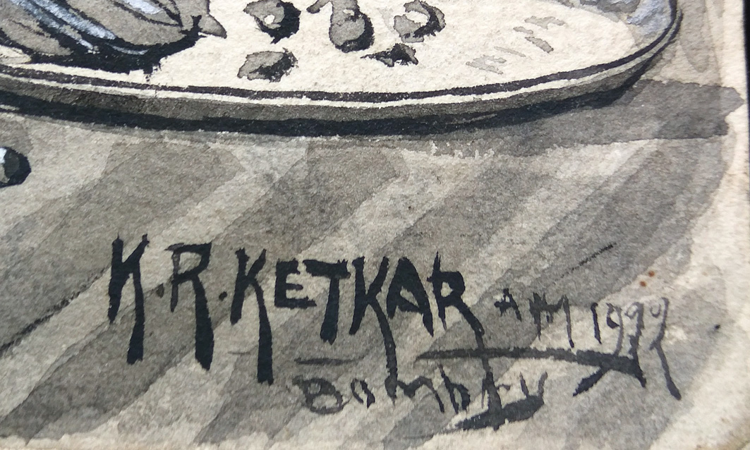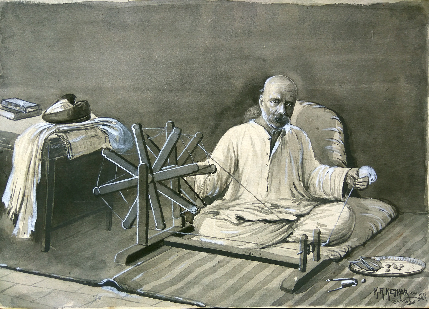 <p>The Bombay School of painting, a style developed by the students of the J J School of Art soon after it was established in 1857.The students achieved proficiency in academic realism and their style is marked by perfect rendering, bold strokes and the use of transparent watercolours.</p> <p>K.R Ketkar was was born in 1893 in Padghvali near Alibag, Maharashtra. He studied at the J J School of Art and completed his Diploma in Drawing and Painting in 1915. He further got his Art Masters Diploma in 1916. He won various merits and scholarships during his time at J J School and in 1917 he won the Mayo Medal. He later founded the Ketkar Art Institute which was instrumental in imparting initial training to a number of important artists like M.R Acharekar, J. M. Ahivasi, D. G. Badiger, V. A Mali and K. H. Ara. This work executed in watercolor, depicts Lokmanya Tilak spinning a charkha. His iconic turban, shawl and the books lay on a table towards the left of the composition. This work is published in the recent publication by Pundole Art Gallery, Encyclopedia:Visual Art of Maharashtra authored by Suhas Bahulkar and Deepak Ghare.</p> <div> </div>