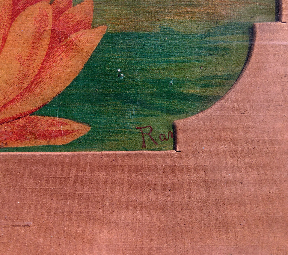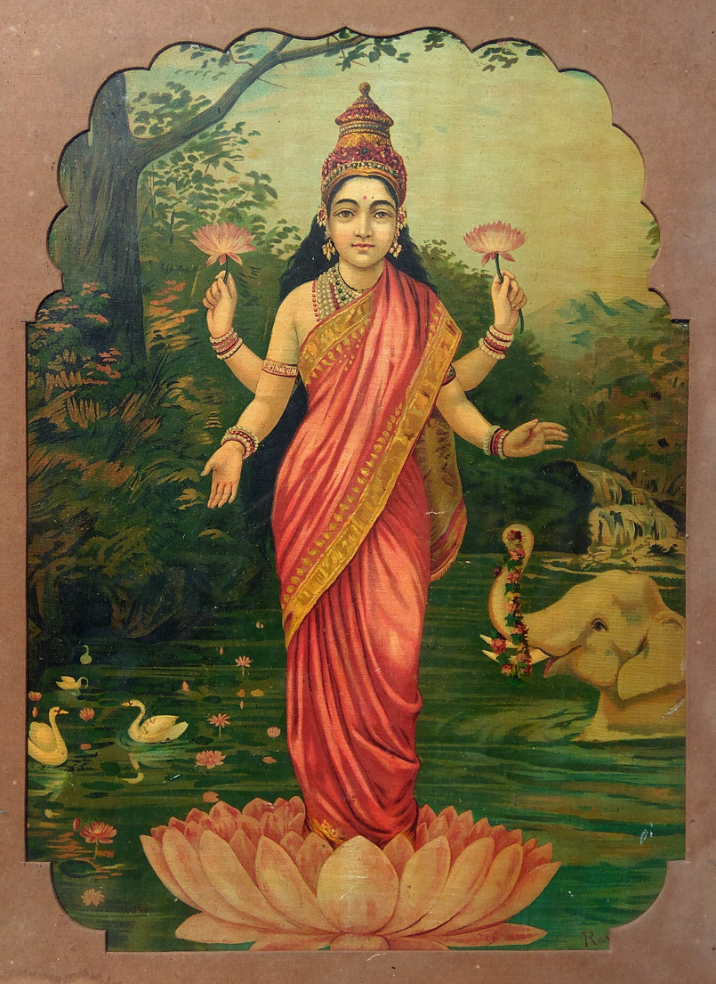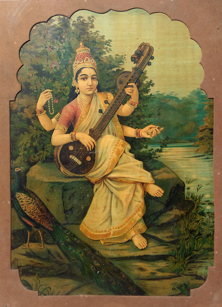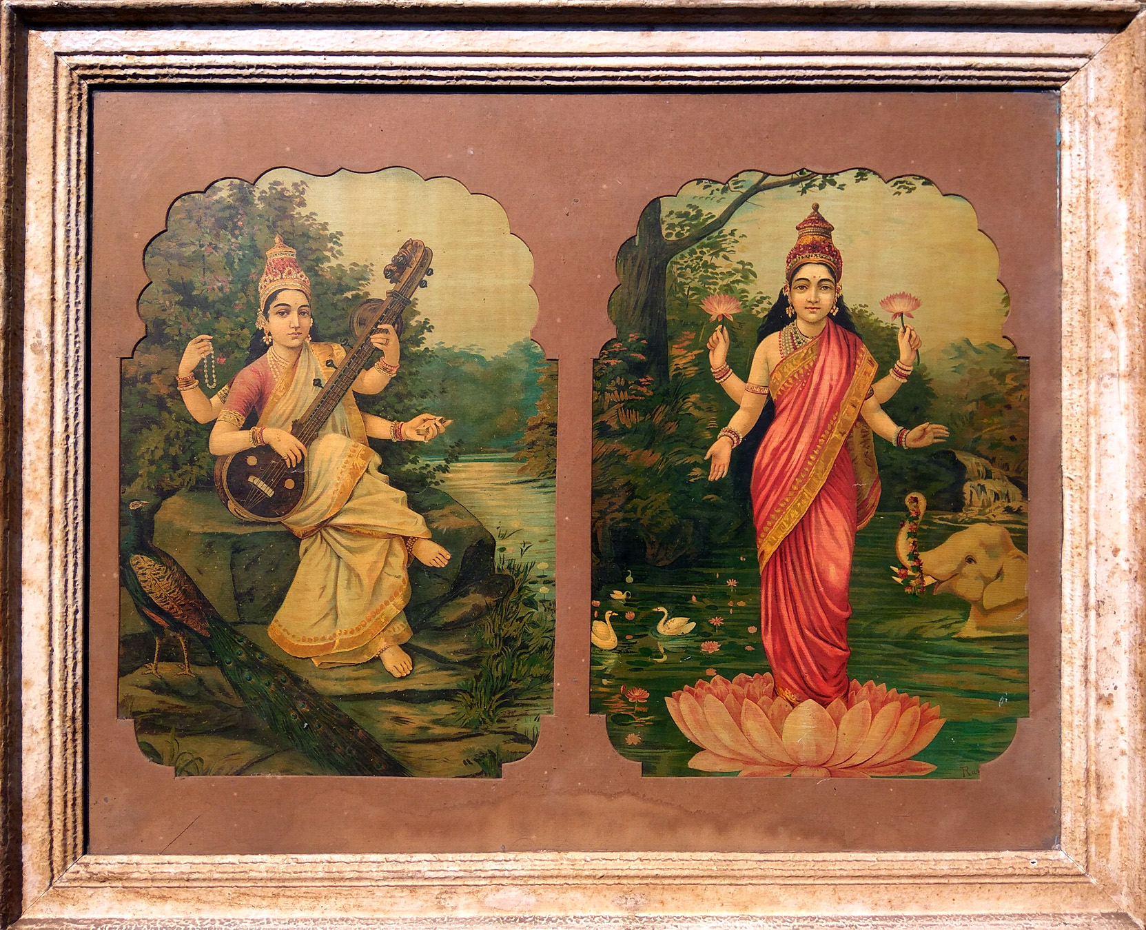 <p><strong>Raja Ravi Varma</strong> was one of the earliest pioneers of the modernist, figurative idiom. Working during the late 19th century, he made scores of paintings of Indian Gods and Goddesses.In 1894 he started a printing press in Mumbai and later shifted it to Malavli near Lonavala, Maharashtra in 1899. The oleographs produced by the press were mostly of Hindu gods and goddesses in scenes adapted mainly from the Mahabharata, the Ramayana and the Puranas. These oleographs were very popular and continued to be printed for many years.</p> <p>Oleographs of two of the most iconic and popular subjects painted by Raja Ravi Varma, Saraswati and Lakshmi, are mounted together in a single frame within two aestheticaly cut mount windows. Dimensions of the visible area of the original 14 x 20 inches oleographs is 12 x 17 inches.</p> <div> </div>