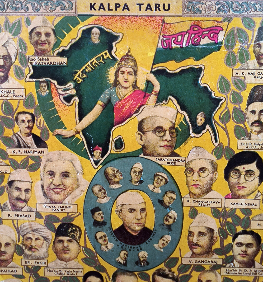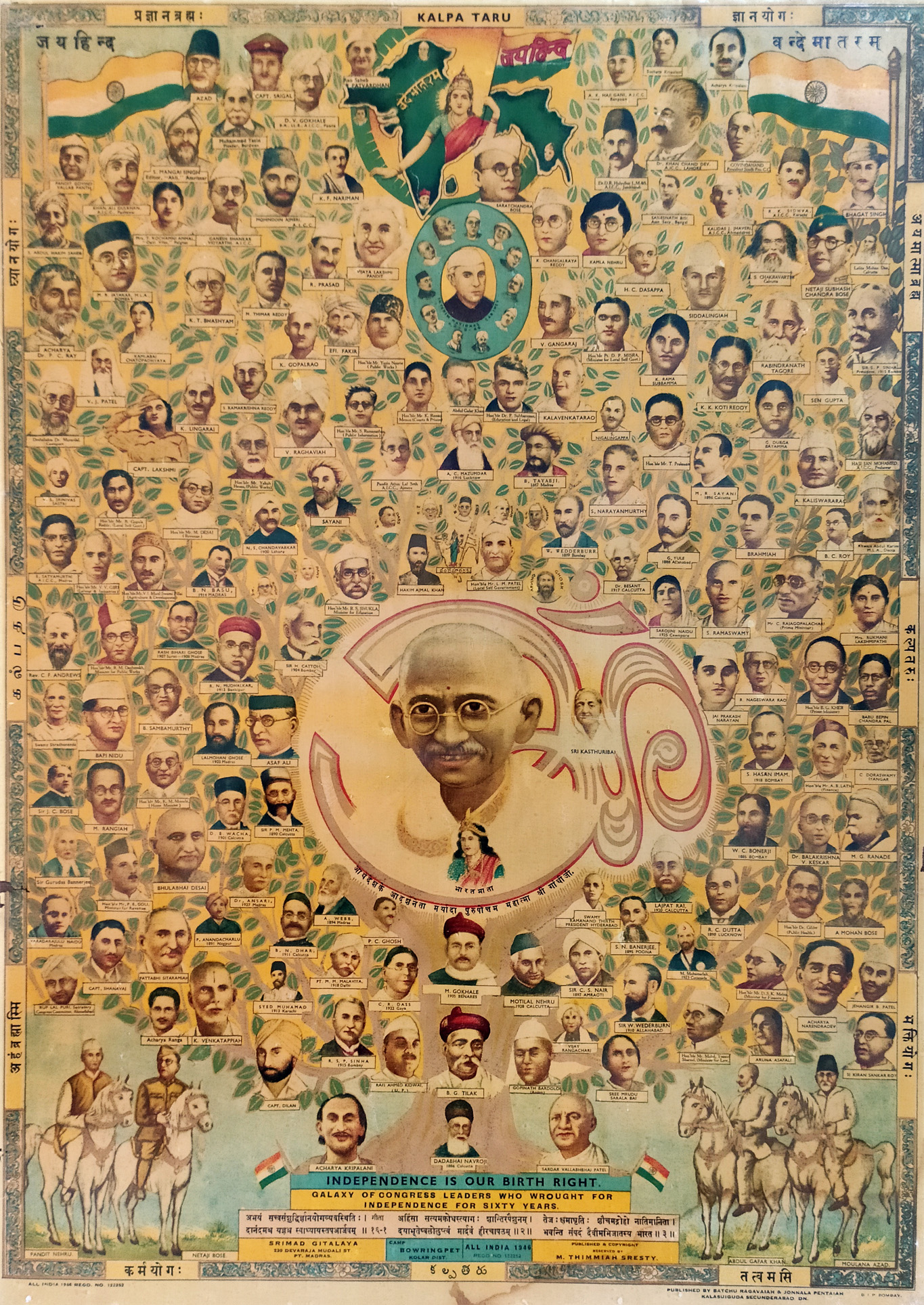 Published in 1946, the chromolithograph titled 'Kalpa Taru' depicts a galaxy of over 180 miniature portraits of Congress leaders around the central image of Mohandas Karamchand Gandhi, which is framed within an ‘Om’. There are two strategic depictions of ‘Bharat Mata’. One at the center-top, where she is shown within the somewhat disproportionate map of undivided India with the tricolor in her hands, while the other in the form of a miniature portrait just below the portrait of Gandhi. There are matching motifs in the four corners, the Indian tricolour flying at the top, and two horsemen in each of the lower ends. They depict Jawaharlal Nehru and Subhas Chandra Bose at the left and Khan Abdul Ghaffar Khan and Maulana Azad at the right.