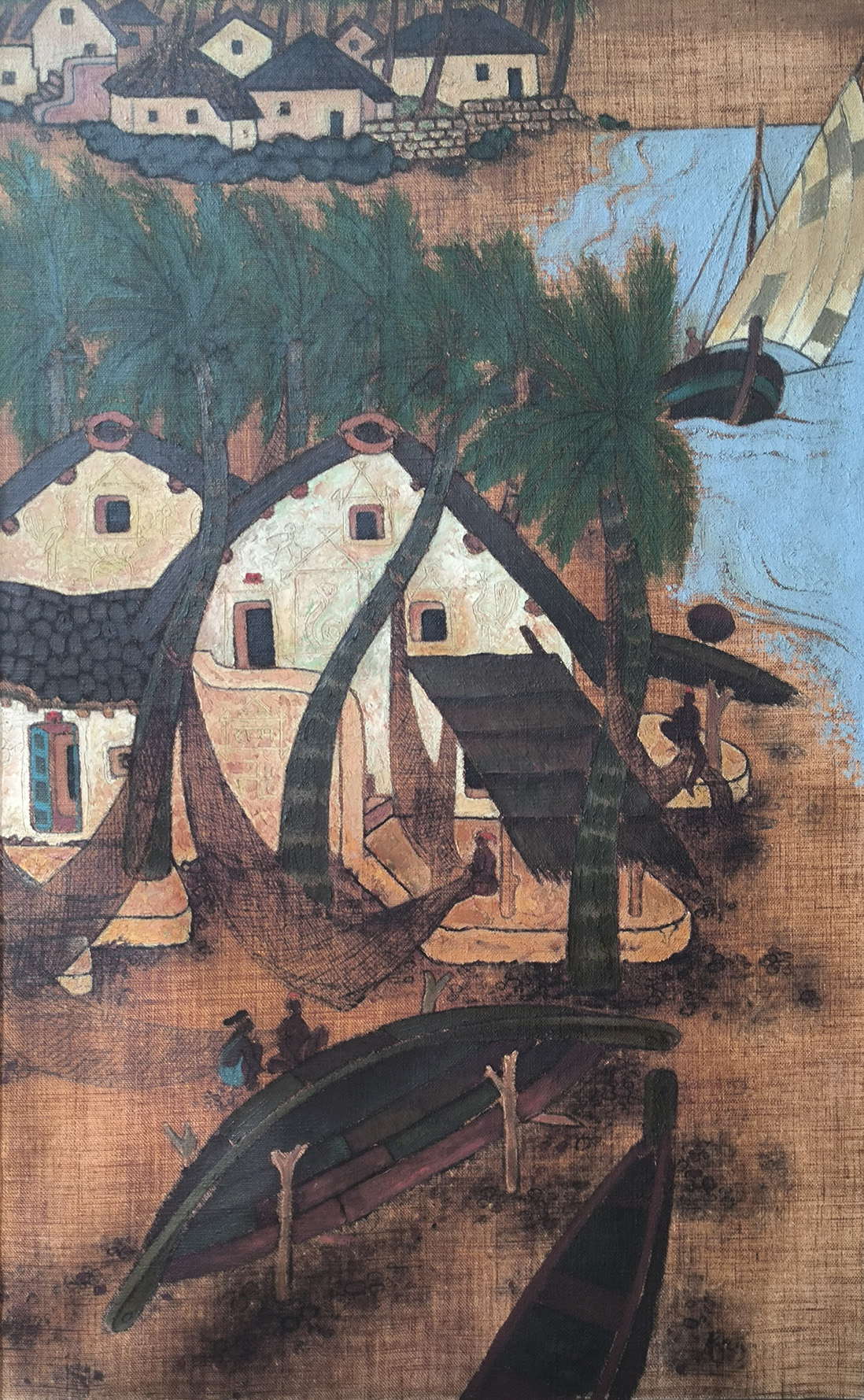 Abdul Aziz Raiba was born in the year 1922 in the city of Bombay. He trained briefly the Nutan Kala Mandir before enrolling in the J.J school of Art in 1942, where he studied Indian Miniature techniques.He was known for his bold shapes and bright colours and for using natural pigments that he made out of lemon and mango peel. He also preferred using scraps of sarees and jute cloth as his canvas.