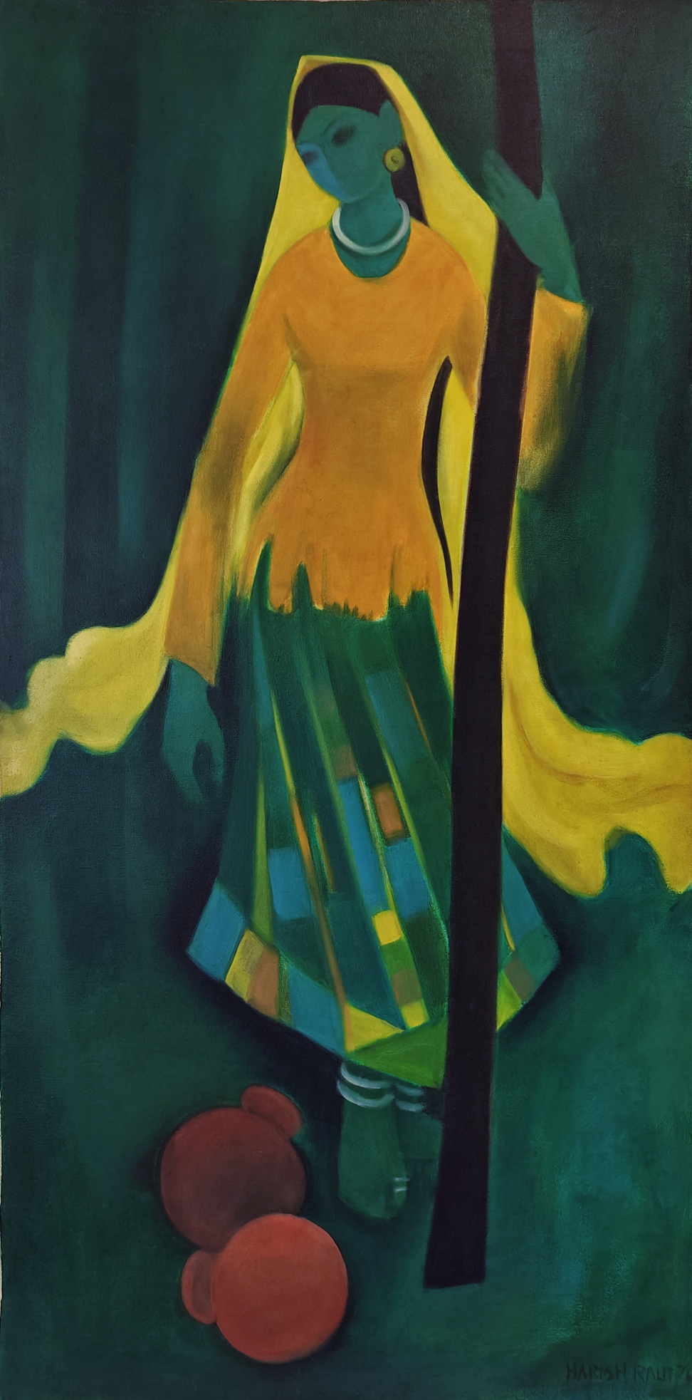 Harish Raut (1925 – 2002) was a Bombay based artist who developed a distinctive figurative style. Idealized rural women, going about their daily chores was the main subject of his work. His early work was based on the rural realities of his hometown Bordi and the neighbouring town of Bassein, Maharashtra. Rural India continued to inspire him and he found his muse once again in the women of Rajasthan, Madhya Pradesh and Kerala.