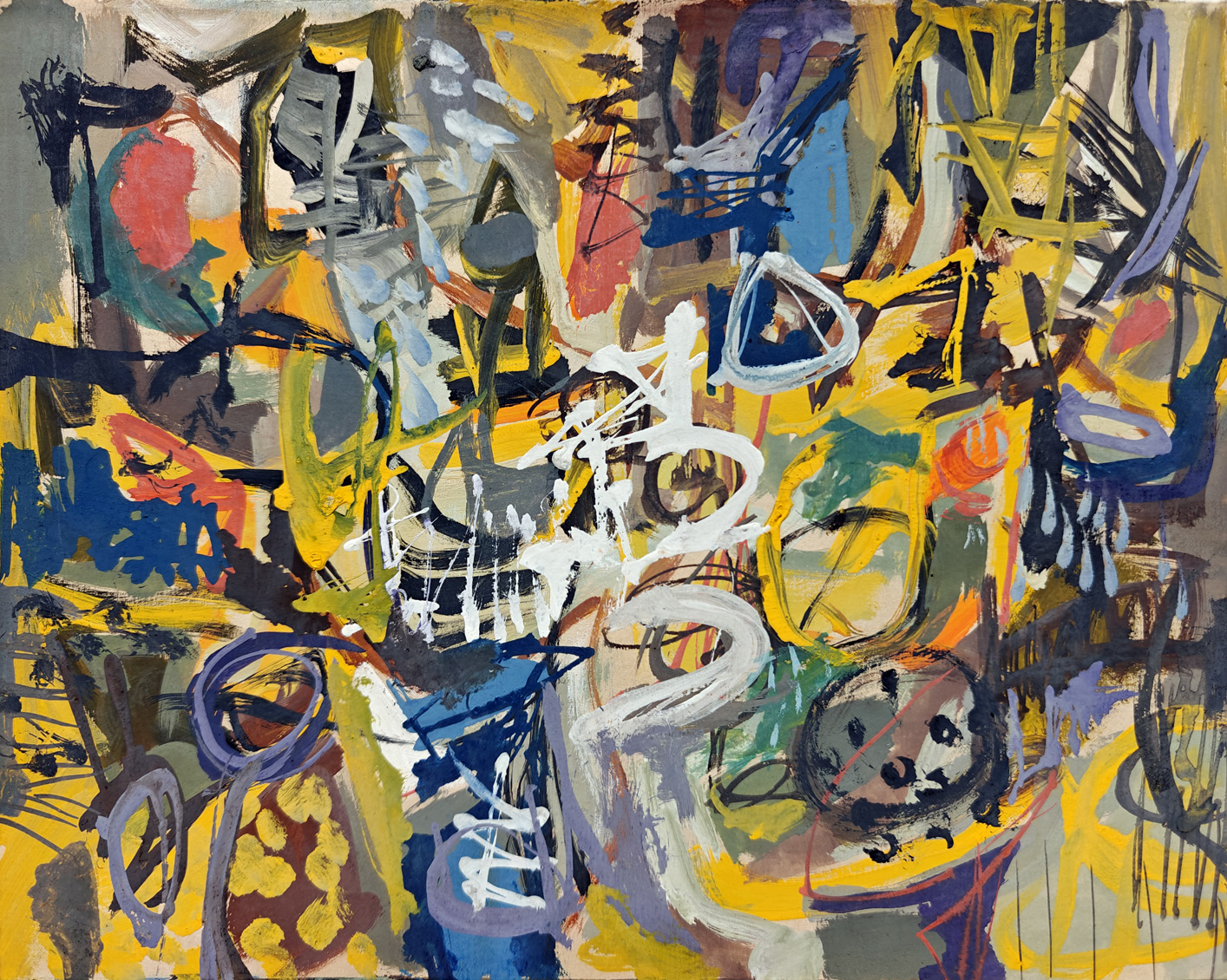 Throughout his itinerant years, Mohite continued to paint. By the 1970s, resettled in Gwalior, he had arrived at an improvisational vocabulary of abstraction, aided by his adoption of acrylic – then a relatively new, quick-drying and dynamic medium that suited his spontaneous approach. This period was the heyday of the abstract idiom in Indian modernism, when painters like V. S. Gaitonde, Bal Chhabda and Ambadas Khobragade, as well as the Neo-Tantrics were active. Mohite’s expressive play of form and space imparted a distinct character to his practice, reflecting both his musical sensibility and mechanical curiosity.