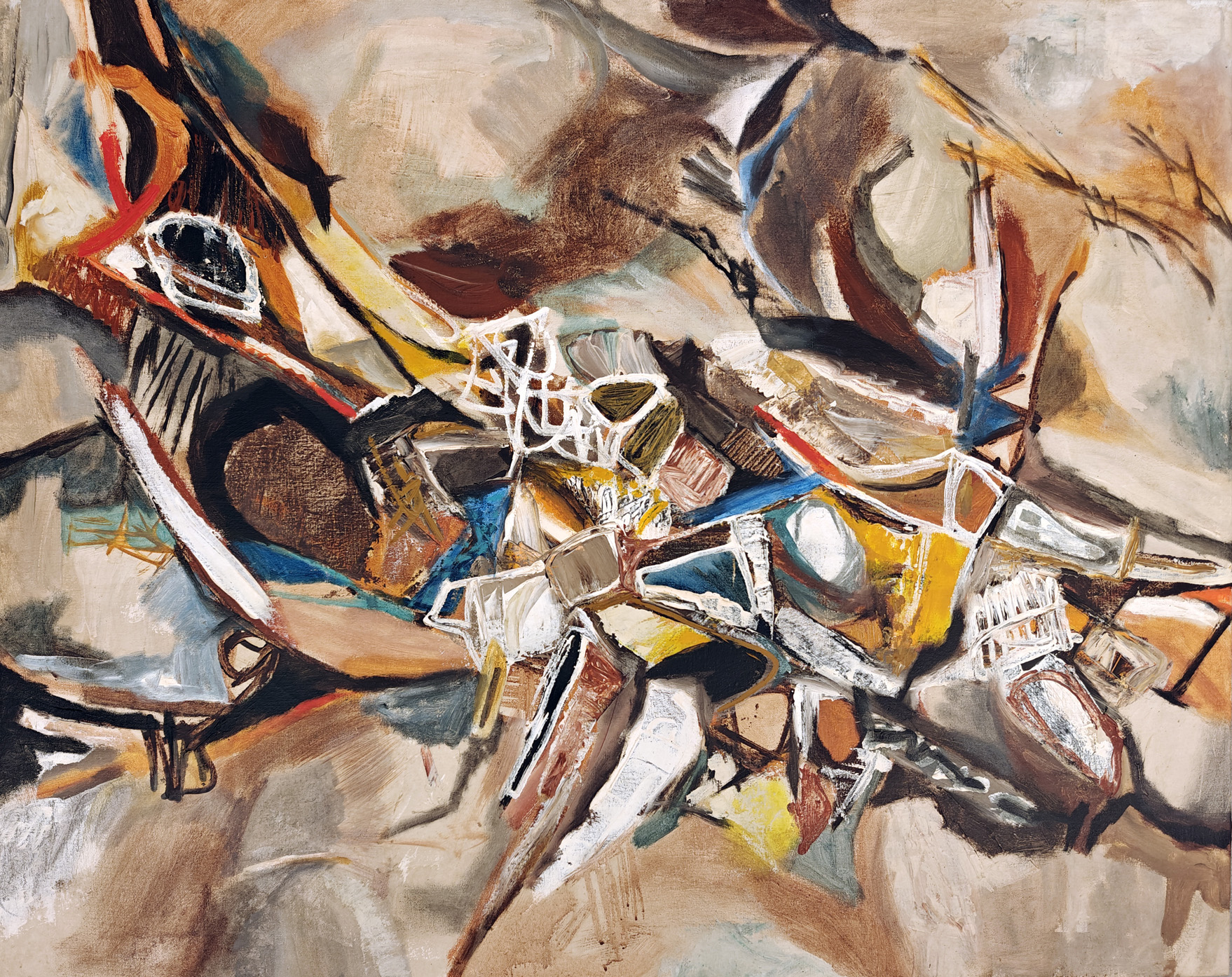 Coming of age soon after, Mohite left Gwalior. Between the late 1950s and mid-1960s, he lived briefly in Bombay as a student at the JJ School of Art’s Commercial Art department – a traumatizing experience for a youth brought up in the countryside, his only sanctuary being artist V. R. Amberkar's studio – before moving to Lucknow as a guest of the Maharaja of Samthar, a classmate of his late father. There, on a lark, he joined the local flying club, donning overalls and learning the mechanics of airplanes, indulging his love for working with his hands. While he never flew the machines, some of his paintings render the drama and dromos of motion almost as optical illusions, relying on both distance and persistence of vision for hints of topographies and figures to emerge.