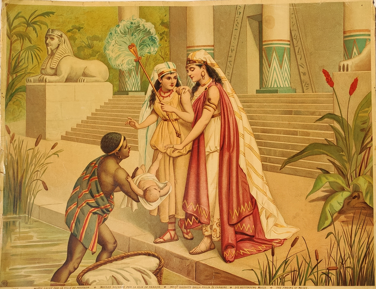 German Lithograph depicting scene from the biblical Book of Exodus. The Pharaoh had commanded that all male Hebrew children born would be drowned in the river Nile, but Moses' mother Jochebed placed him in an ark and concealed the ark in the bulrushes by the riverbank, where the baby was discovered and adopted by Bithiah, the Pharaoh's daughter, and raised as an Egyptian.